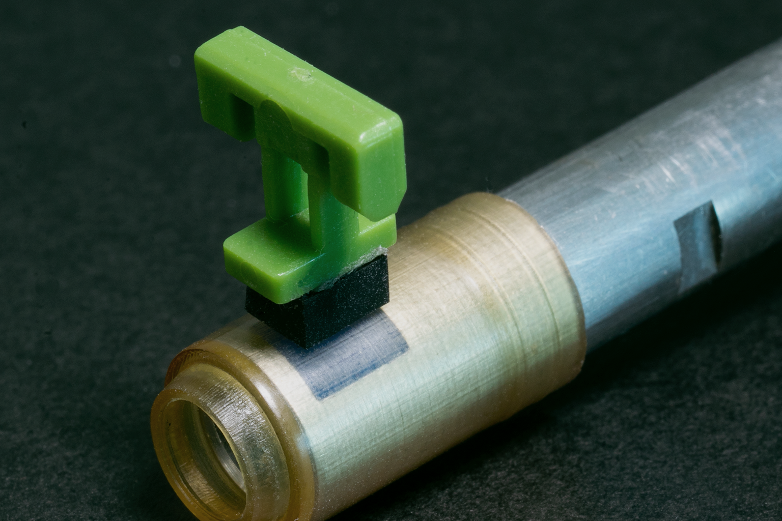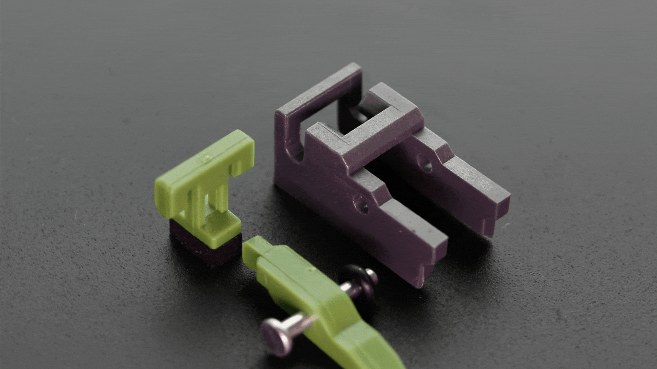 The main bracket: This fits onto the original Tokyo Marui hop-up chamber and acts as a medium to guide the trolley moving vertically up and down to apply hop-up. It is designed to restrict the movement of any other axial directions, and limit only on the vertical axis.