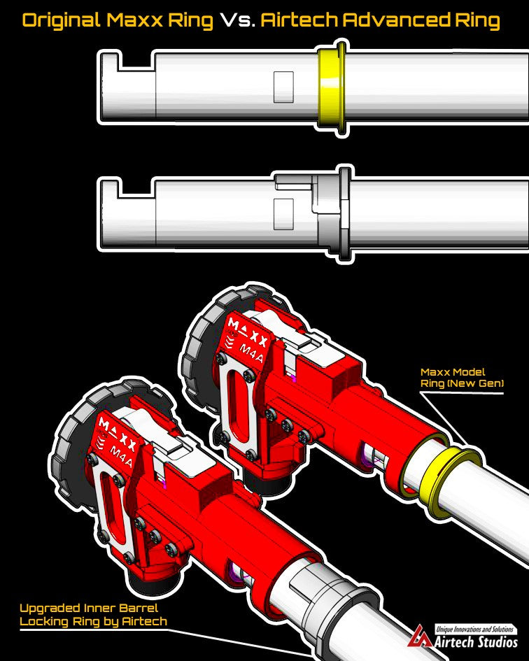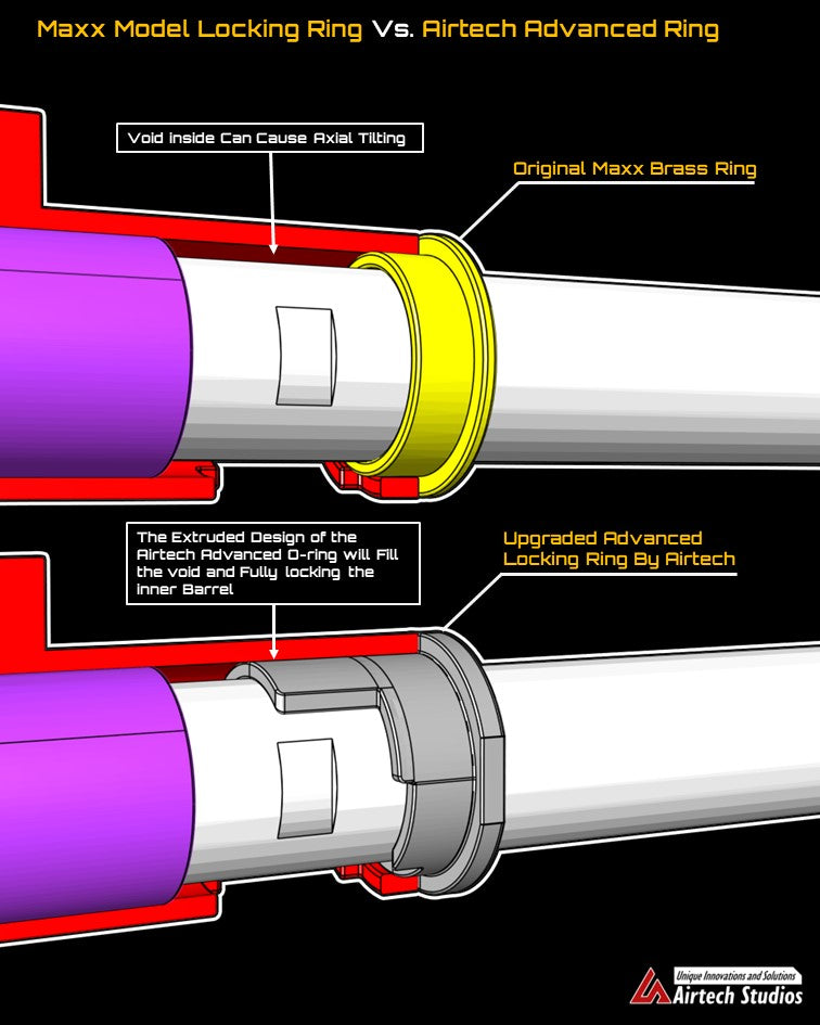 The Advanced locking ring is designed to replace the current Maxx O-ring (Normally brass) ring at the end of setting up the hop unit, however, with the original, there is a tendency for a wobbly gap in between the components which would tilt the barrel at an angle.